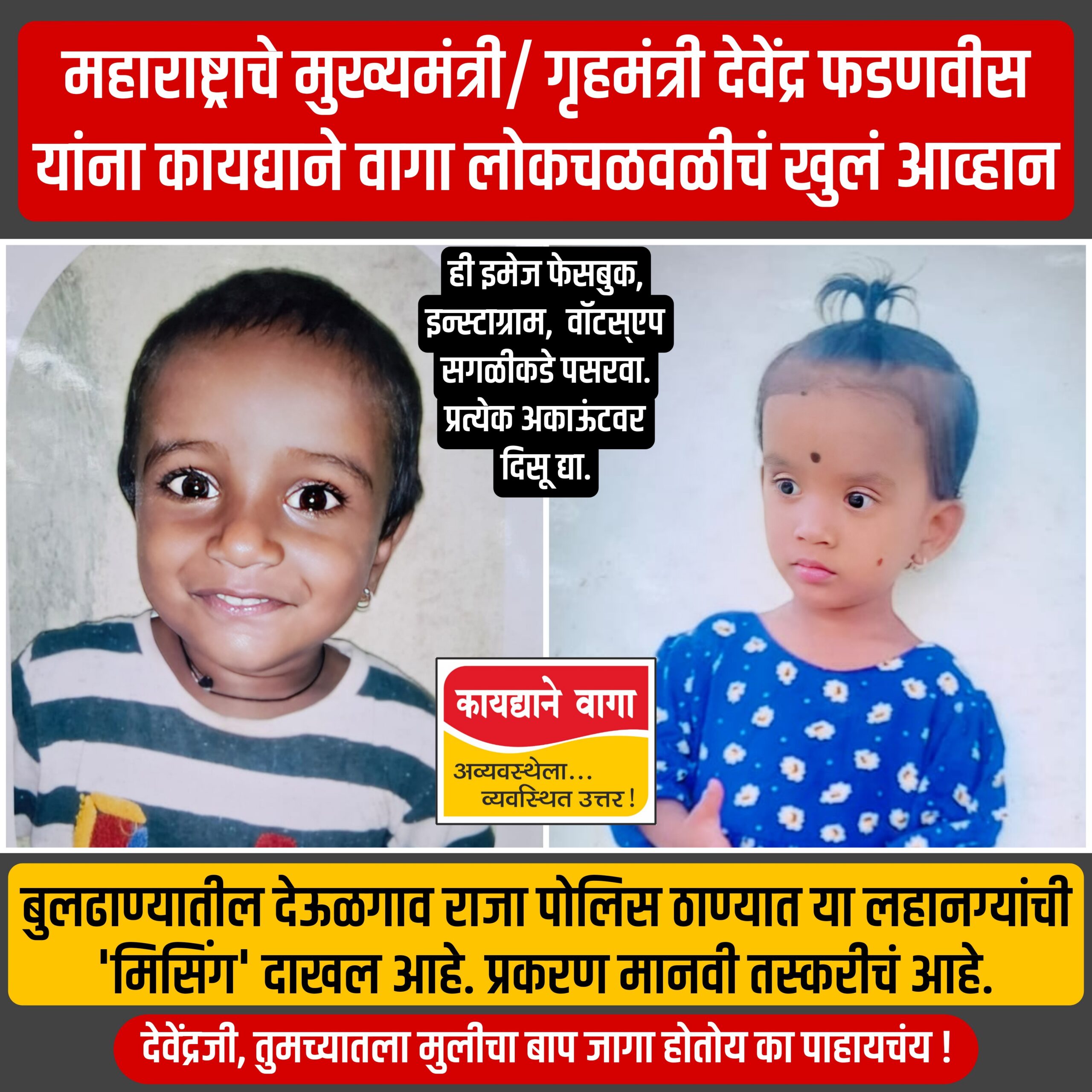 राज्याच्या मुख्यमंत्र्यांनी मनात आणलं तर २४ तासांच्या आत ही लहानगी मुलं हुडकून काढता येतील. आपणही एका मुलीचे बाप आहोत, इतकी जाणीव त्यांच्यात जागी व्हायला हवी आणि लोकप्रतिनिधी म्हणून कर्तव्याशी प्रामाणिकपणा दाखवायला हवा. रिकामटेकडे विषय सोडून जनतेचे प्रश्न सोडविण्यासाठी सत्ता राबवायला हवी. स्वयंस्फूर्तता नसेल तर किमान सर्वोच्च न्यायालयाने दिलेल्या निर्देशांचं पालन करण्याचे सोपस्कार तरी करायला हवेत. अशी शेकडो बेपत्ता मुलं आपल्या कुटुंबात परततील आणि महाराष्ट्रात पुन्हा कोणाचं मूल पळवण्याची कोणाची हिंमत होणार नाही ! मला खात्री आहे, मुख्यमंत्री हे आव्हान स्वीकारतील ! अशी पोस्ट करून कायद्याने वागा लोकचळवळीचे प्रणेते राज असरोंडकर यांनी सदर प्रकरणात लक्ष घालण्यासाठी मुख्यमंत्री कम गृहमंत्री देवेंद्र फडणवीस यांना साकडं घातलं आहे.