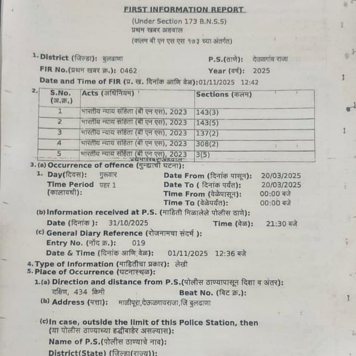 दरम्यानच्या काळात कायद्याने वागा लोकचळवळ आणि मीडियाभारत ने या प्रकरणाला सार्वजनिकरित्या वाचा फोडल्यावर उल्हासनगरातील हिललाईन पोलिस ठाण्यात शून्य क्रमांकाने गुन्हा दाखल करण्यात आला, जो मागाहून देऊळगाव राजा पोलिस ठाण्यात वर्ग करण्यात आला.